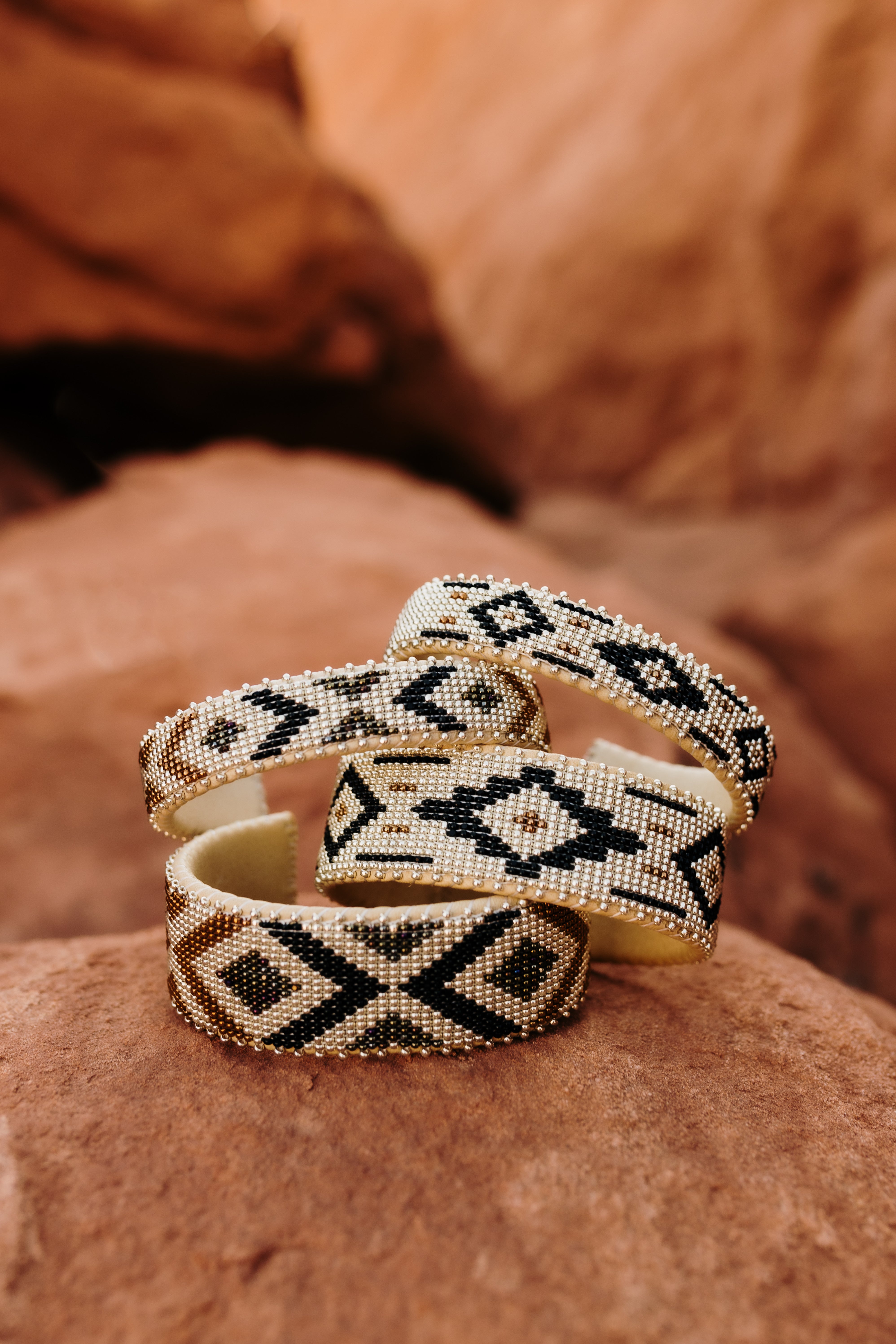 We partner with eleven artisans in New Mexico, who handloom each and every piece using skills passed down through generations. Each beaded bracelet is a testament to their dedication, blending traditional techniques with personal stories and artistry. They work on their on time, in their own spaces, and earn a living wage for their work. By respecting the creativity and technique of each artisan, we are able to help support their independence in a way that works for them.